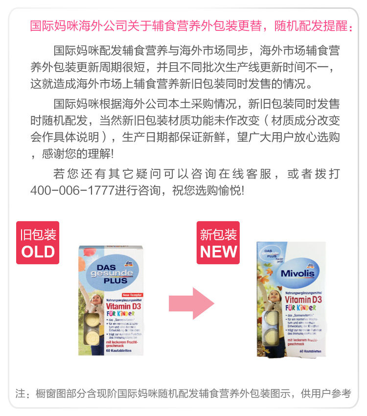 성분: 비타민 D3 10ug, 단백질 및 소금, 당분이 함유되어 있다.당 당 당 은 0.01그램 보다 작다 인파:4세 이상 어린이 규격:60편 사용 방법: 매일 한 조각, 씹으면 된다 주의 사항: 1. 추천량이나 같은 종류의 영양보충제와 함께 먹는 것이 적합하지 않다. 2.어린이를 건드릴 수 있는 곳에 놓아두지 마시오. 3.빛을 피하고 건조하고 25도보다 높지 않은 곳에 보관하세요. 4. 본품은 식용 영양보충제로 약물을 대체할 수 없다. 판매지: Germany/독일 브랜드: Mivolis |